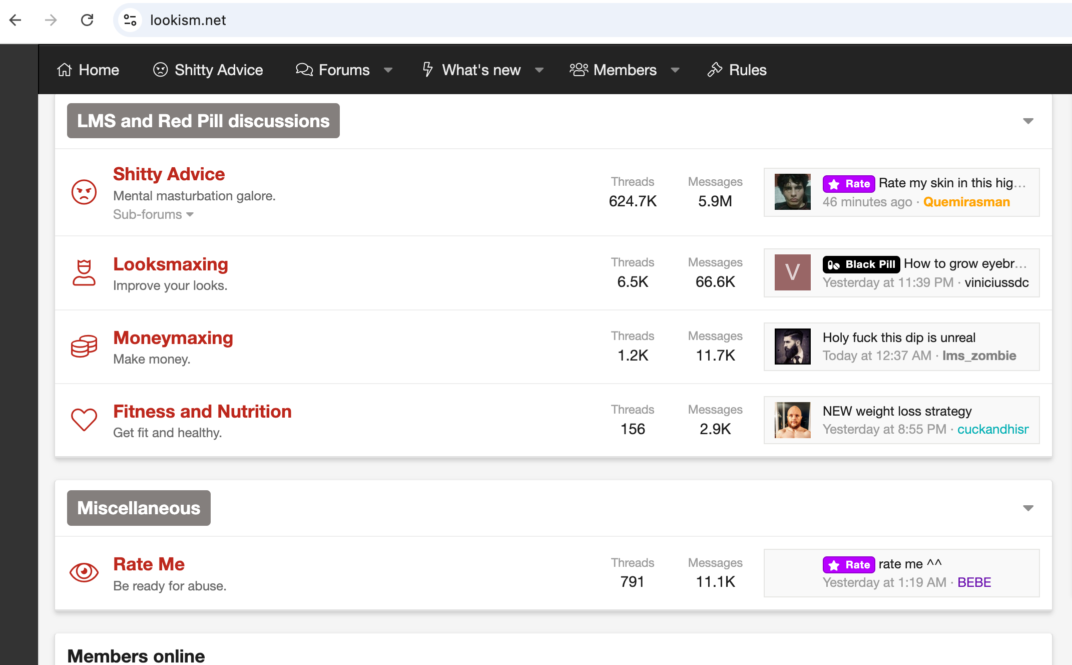 Segurament, l’espai d’internet que flirteja més clarament amb una idea de bellesa no-humana, tant pel cànon que proposa com pel to de la conversa, és el món del looksmaxxing o l’optimització tècnica de l’aspecte físic. Els looksmaxxers són una comunitat originalment centrada en l’ideal de bellesa masculí en espais incels i de l’altright. Alguns mitjans apunten l’origen en pàgines creades al llarg dels 2010s com lookism.net, un fòrum encara actiu avui, de creació anònima i amb adreça a Panamà.